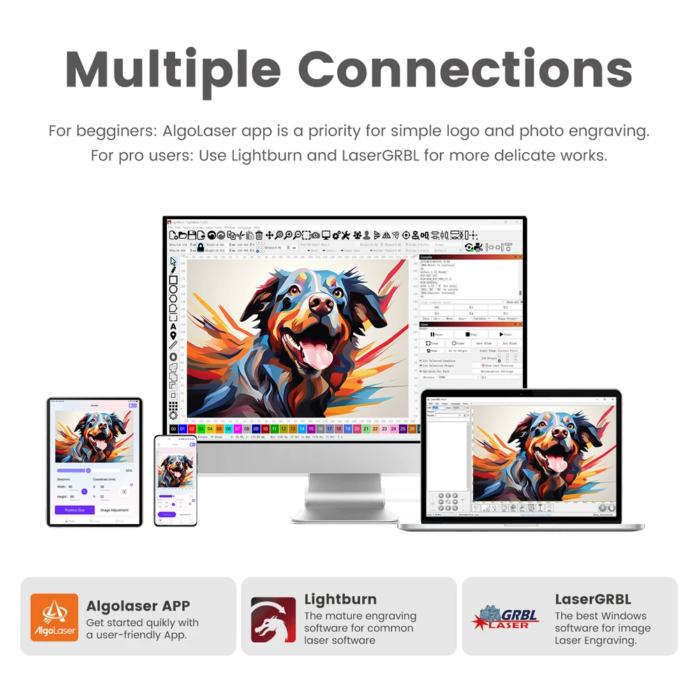 Powerful Compatibility - AlgoLaser DIY KIT MK2 Supports offline connection via WiFi-2.4 GHz and TF card (built-in 8G); Supports wired connection via USB Type-A & Type-C; Supports USB stick connection (LaserGRBL/Lightburn software). It supports import with BMP, JPG, PNG, DXF, AI, SVG file format and so on.