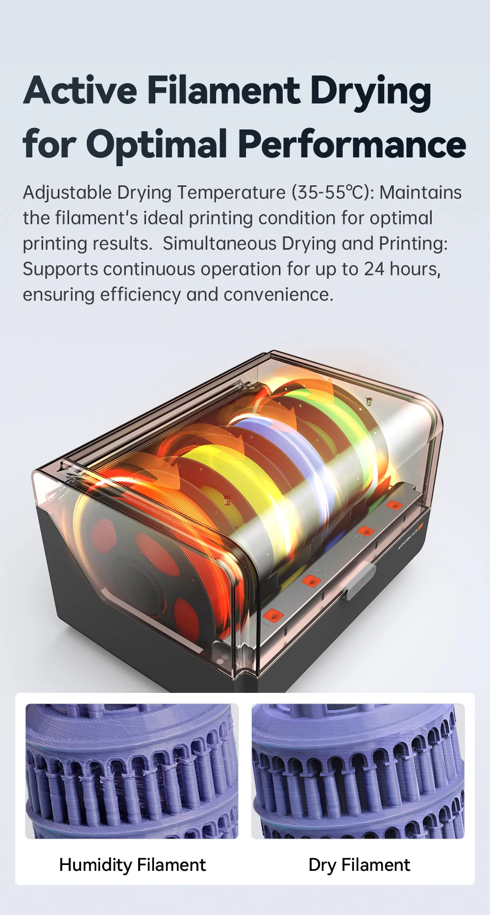 Adjustable Drying Temperature (35-55°c): Maintains the filament's ideal printing condition for optimal printing results. Simultaneous Drying and Printing:Supports continuous operation for up to 24 hours,ensuring efficiency and convenience.