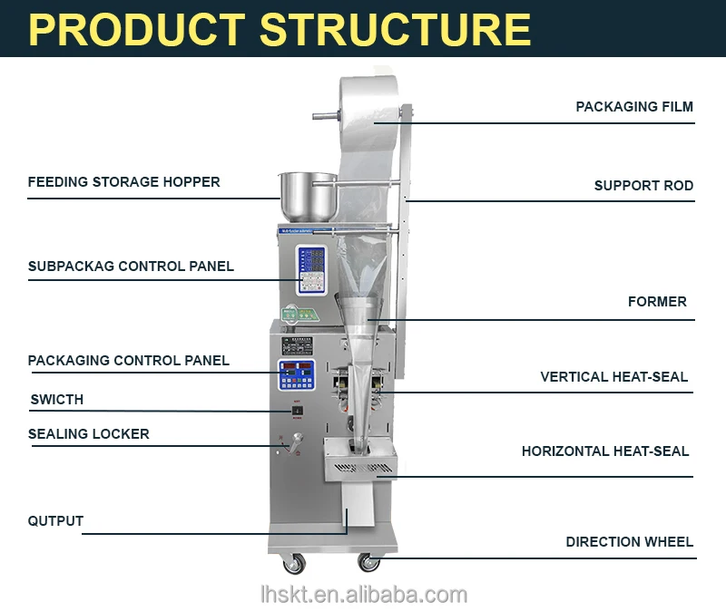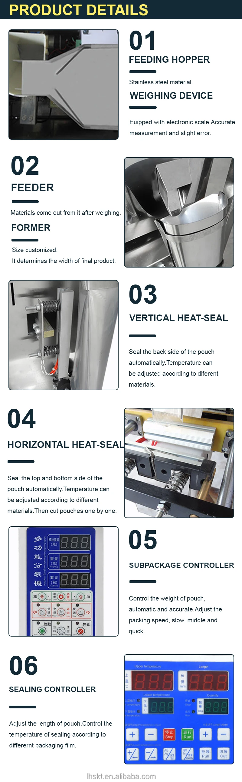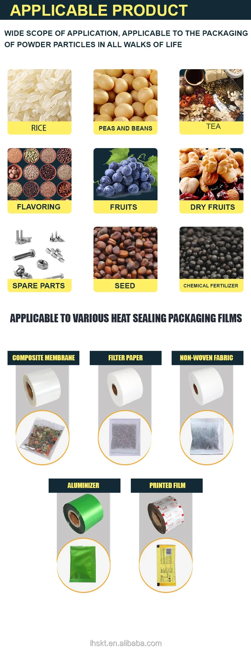 Automatic filling design, quick cutting, innovative and intelligent, high efficiency; can set the length of the bag, more convenient and accurate. Suitable fbr all kinds of powders, drug granules, small electronic accessories, tea & flower