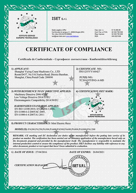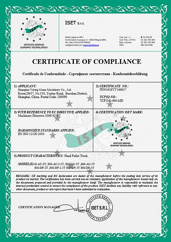 At TIANJIN KONOVI TECHNOLOGY CO.,LTD, we are committed to providing the highest quality products and services to our customers. We are proud to announce that we have recently obtained several product certification certificates from various organizations around the world. These certificates demonstrate our commitment to excellence, and provide our customers with the assurance that our products meet the highest standards of quality, safety, and performance. Our products have been certified by leading organizations in various countries, including Saudi Arabia, Italy, United States, and Philippines. These certifications cover a wide range of products, including pallet jacks,hoists, and are a testament to our dedication to providing the best possible products to our customers.
