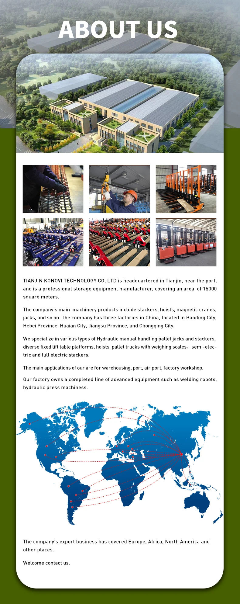 The main business is the sales of lifting machinery and mechanical equipment, the retail of hardware products, the research and development of mechanical equipment, the sales of metal chains and other metal products,such as hand pallet jack,semi-electric pallet jack,full electric pallet jack.