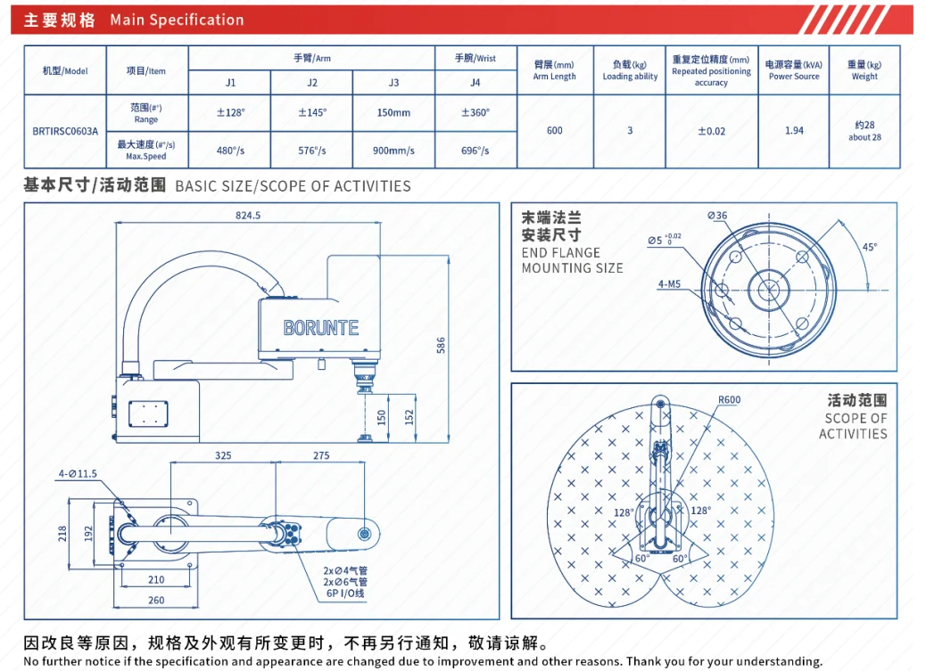BRTIRSC0603A is a four axis robot developed by BORUNTE for certain monotonous, frequent, and repetitive long-term tasks. It has a 600mm arm span and a maximum load of 3kg. It has multiple degrees of flexibility and is mainly used in fields such as printing and packaging, metal processing, light textile home furnishings, electronic equipment, etc.