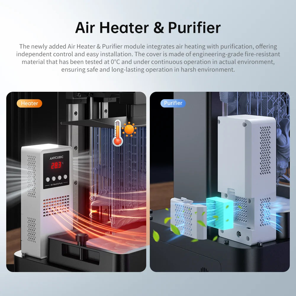 It supports air heating ensuring the air temperature up to 40 ℃and keep the resin temperature reach above 20 ℃ before printing for achieving successful printing even in low-temperature environments. Additionally, a dedicated purification mode is supported, with a built-in high-quality activated carbon component that effectively absorbs resin odors, creating a comfortable printing environment.