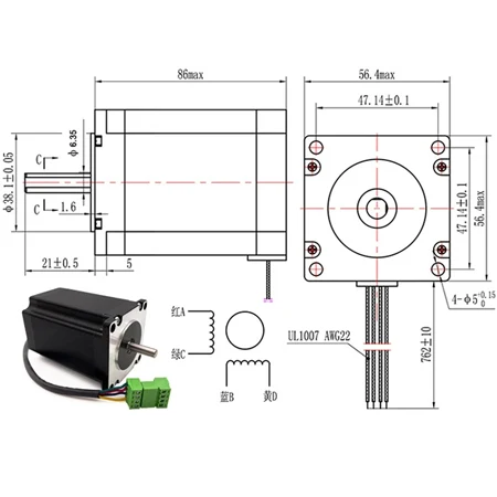 ● Holding torque: 2.45N.m ● Rated voltage: 3.6V ● Rated current: 3A ● Step angle: 1.8°±5% ● Phase number: 2 ● Insulation resistane: 100MΩ min.(500V DC) ● Insulation class: Class B ● Rotor inertia: 600g.cm2 ● Resistance per phase: 1.2Ω±10% ● Inductance per phase: 4mH±20% ● Detent torque: 90mN.m ● Suit for Controller: CNC xPROV5, UC300, High Current GRBL etc.