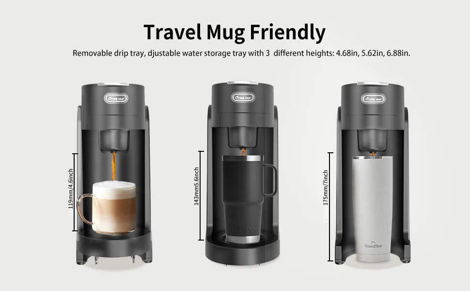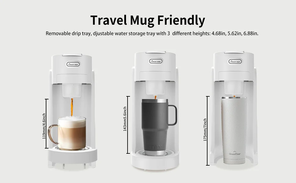 7. Removable water reservoir with adjustable height settings (3 levels: 119mm, 143mm, 175mm)