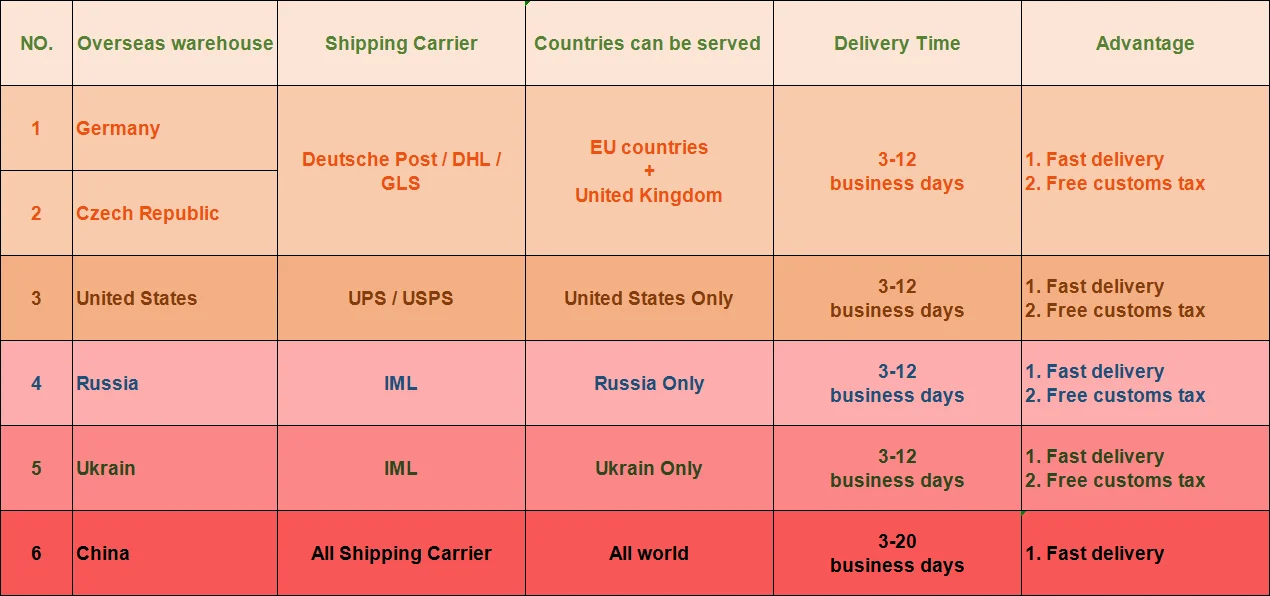 We have warehouse in Germany, Czech Republic, United Kingdom, we can ship to EU countries via DHL/UPS, which is very fast delivery.
