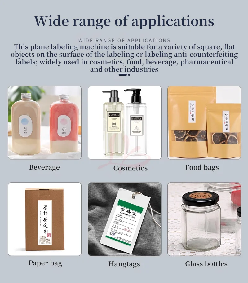 This plane labeling machine is suitable for a variety of square, flat objects on the surface of the labeling or labeling anti-counterfeiting labels; widely used in cosmetics, food, beverage,pharmaceutical and other industries