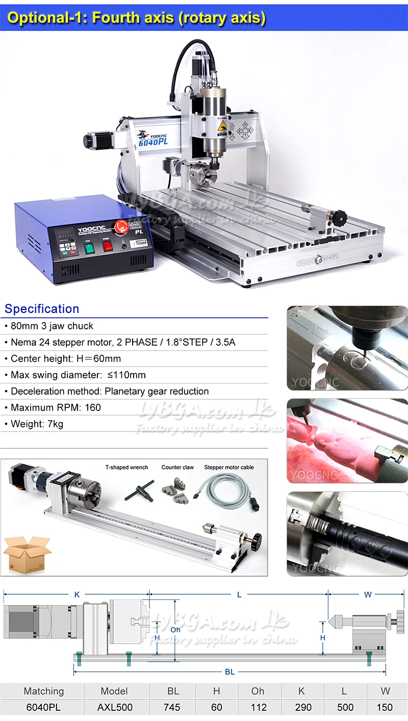 80mm 3 jaw chuck Center height: H = 60mm Maximum turning diameter: ≤ 110mm Deceleration method: Planetary gear reduction Nema23 stepper motor, 2 PHASE/ 1.8°STEP /3.5A Maximum RPM: 160 Weight: AXL500=7.0KG |