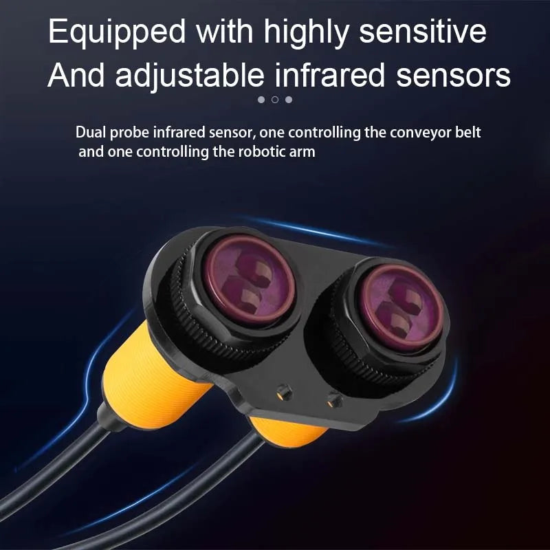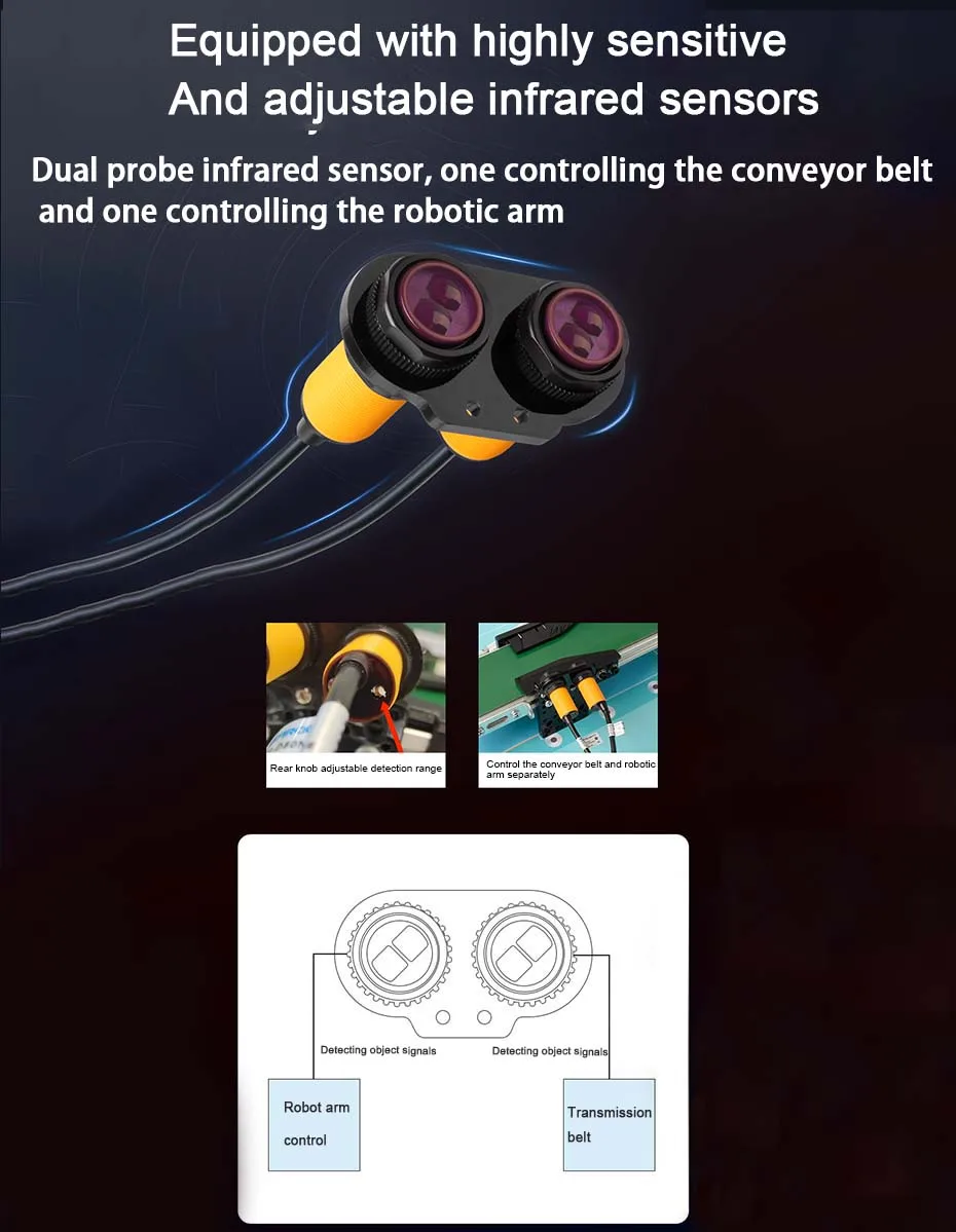 Infrared sensor signals can be collected to control the operation and stop of the transmission belt. The robotic arm adopts a high torque servo, combined with a microcontroller controller to achieve synchronous control.