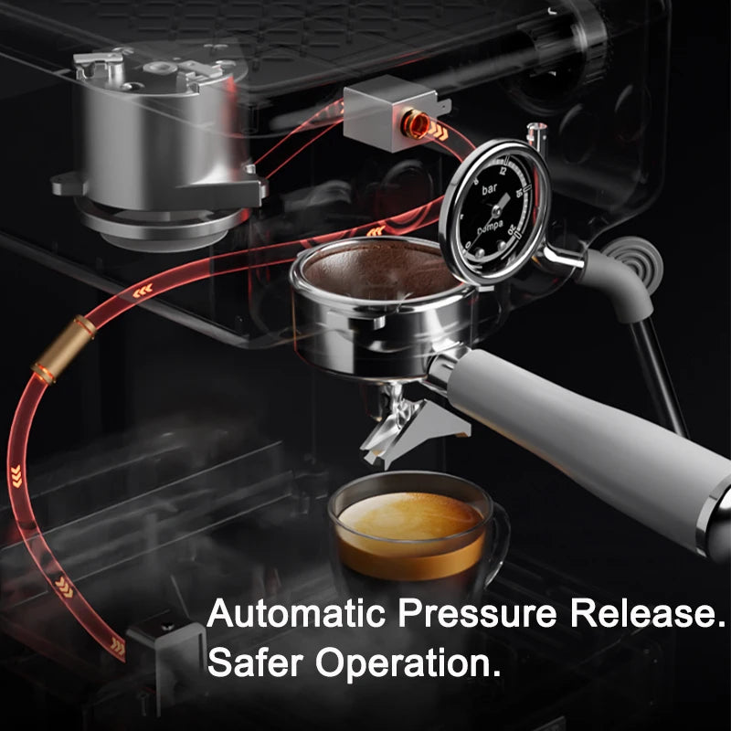 ✔LOW Pressure Pre-lnfusion——The low-pressure prepreg gradualty increases tie pressureat the beginning, and releases a small amount of water intothe mashed coffee powder before a steady flow of water toobtain a stronger espresso.