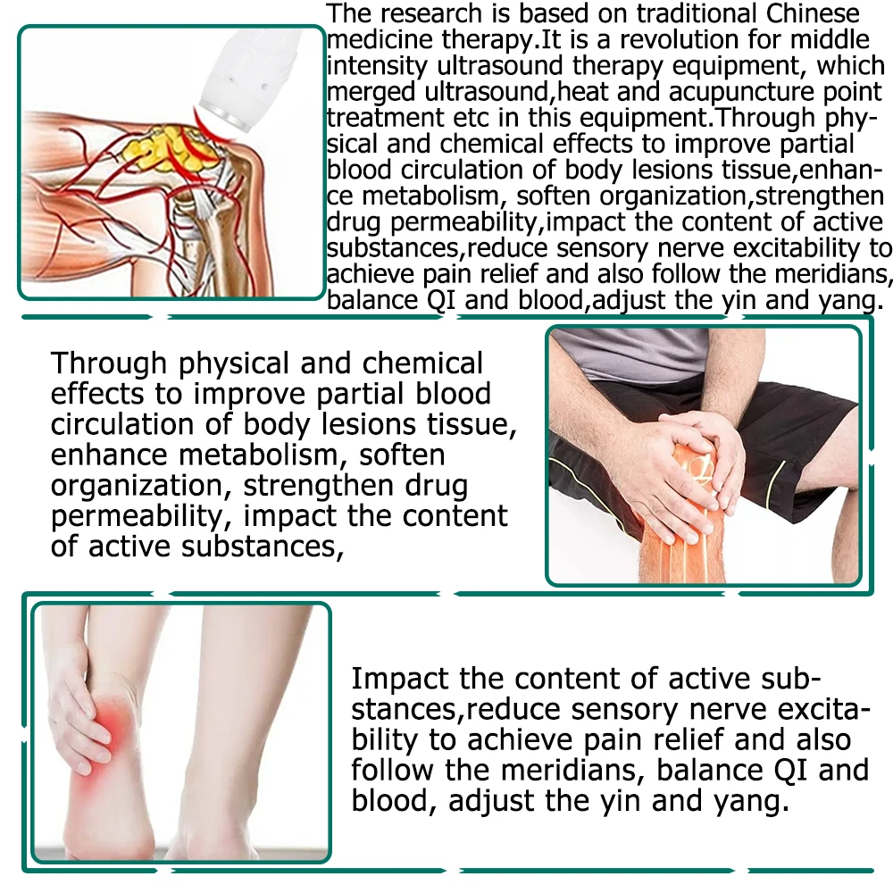 The research is based on traditional Chinese medicine therapy.It is a revolution for middle intensity ultrasound therapy equipment, which merged ultrasound,heat and acupuncture point treatment etc in this equipment.Through physical and chemical effects to improve partial blood circulation of body lesions tissue, enhance metabolism, soften organization, strengthen drug permeability, impact the content of active substances,reduce sensory nerve excitability to achieve pain relief and also follow the meridians, balance QI and blood, adjust the yin and yang.