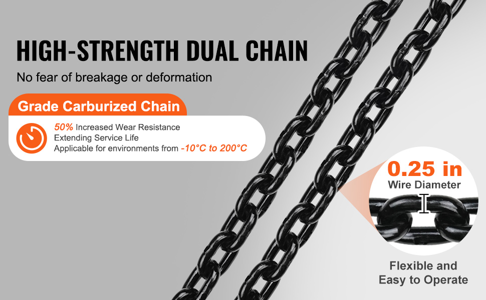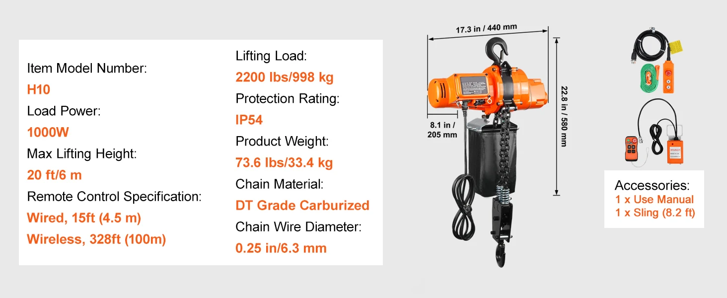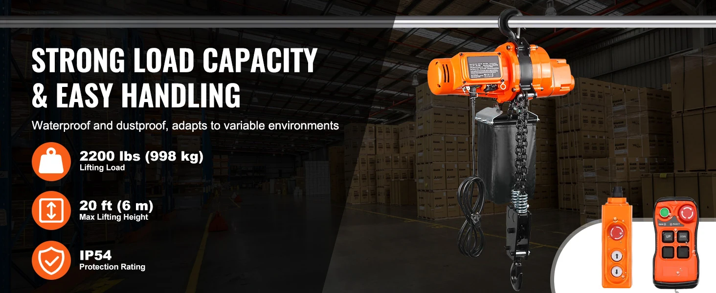 2200 lbs Load Capacity: Say hello to 2200 lbs of lifting power! Our electric chain hoist comes with a top-grade DT carburized chain for durability and strength. Plus, with a 20 ft (6 m) lifting height, it's flexible enough for any space.