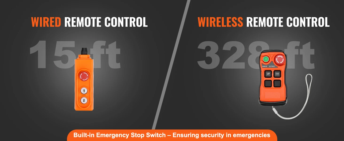 Wireless & Wired Dual Control: Our chain electric lift hoist lets you choose between a 15 ft security cable for wired control and a 328 ft wireless range for ultimate freedom. Perfect for workshops and outdoor jobs, it's the ultimate efficiency booster.