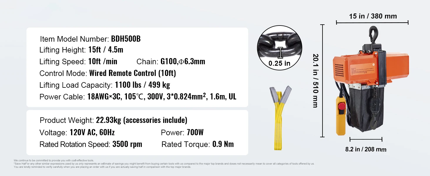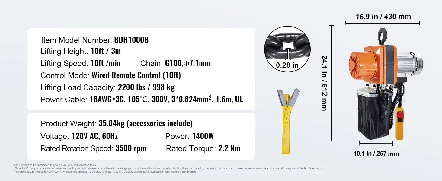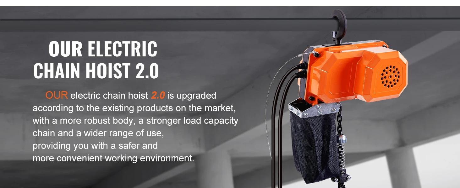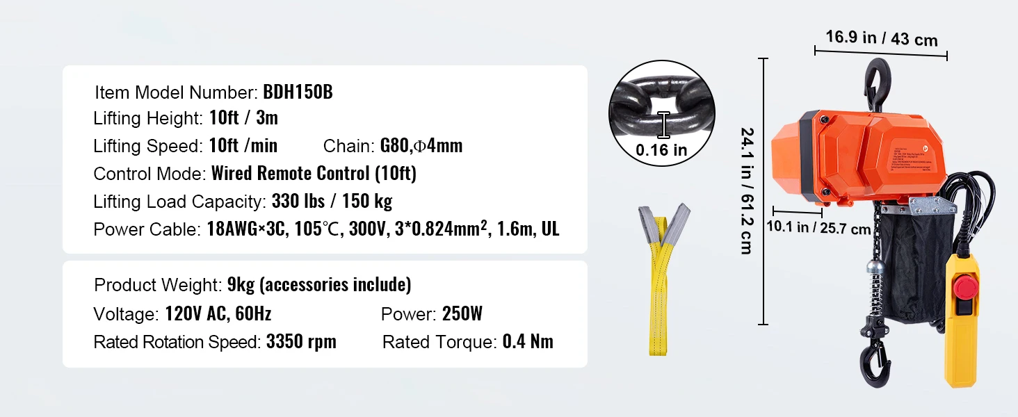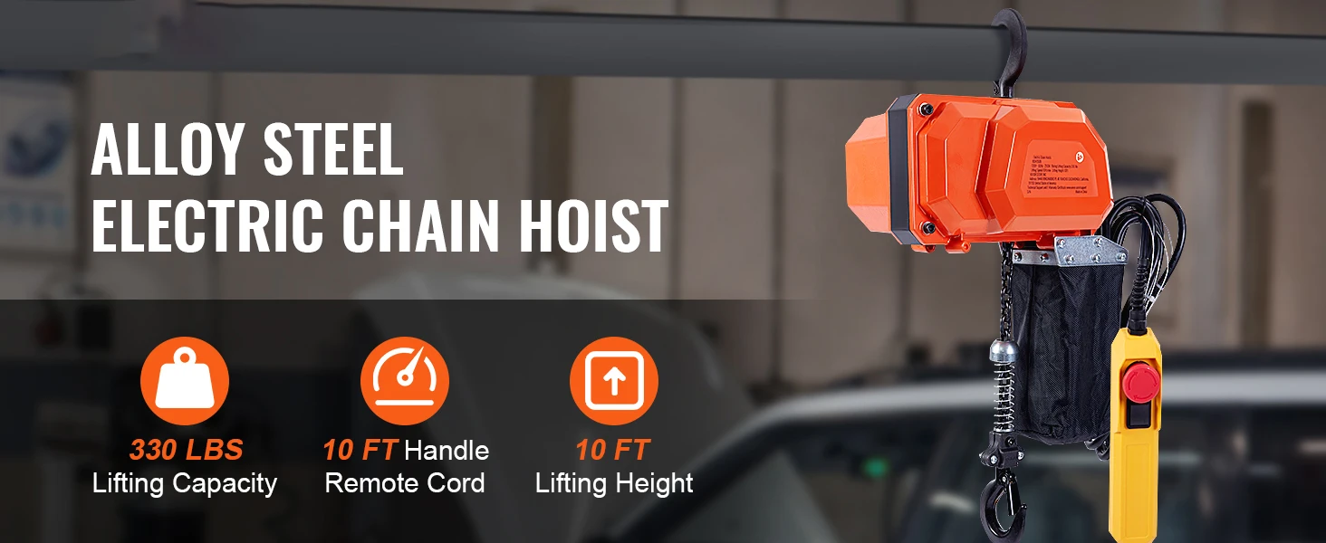 330/1100/2200 lbs Load Capacity: Our electric chain hoist is equipped with a G80 chain to provide a safe lifting capacity of 330 lbs/150 kg. It can lift all kinds of heavy objects at a speed of 10 ft/min (3 m/min) with a maximum lifting height of 10 ft/3 m.