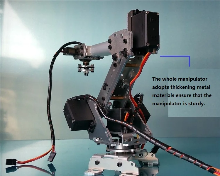 - 6 degrees of freedom manipulator, all-metal robot arm, bottom joint are made of metal gear servos forceful, beautiful and practical structure, roughly the size of the arm, such as pictures in the standard, sometimes different batches size will be small change.