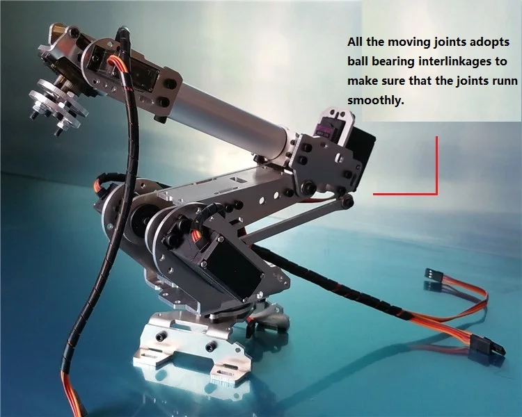 - This 6 DoF robot arm is designed from the ABB model by the similar principle. This joint of manipulator is connected by the good bearings, which can make the arm move with the smallest friction. So, it is the best choice for the teaching, function realization, and so on.