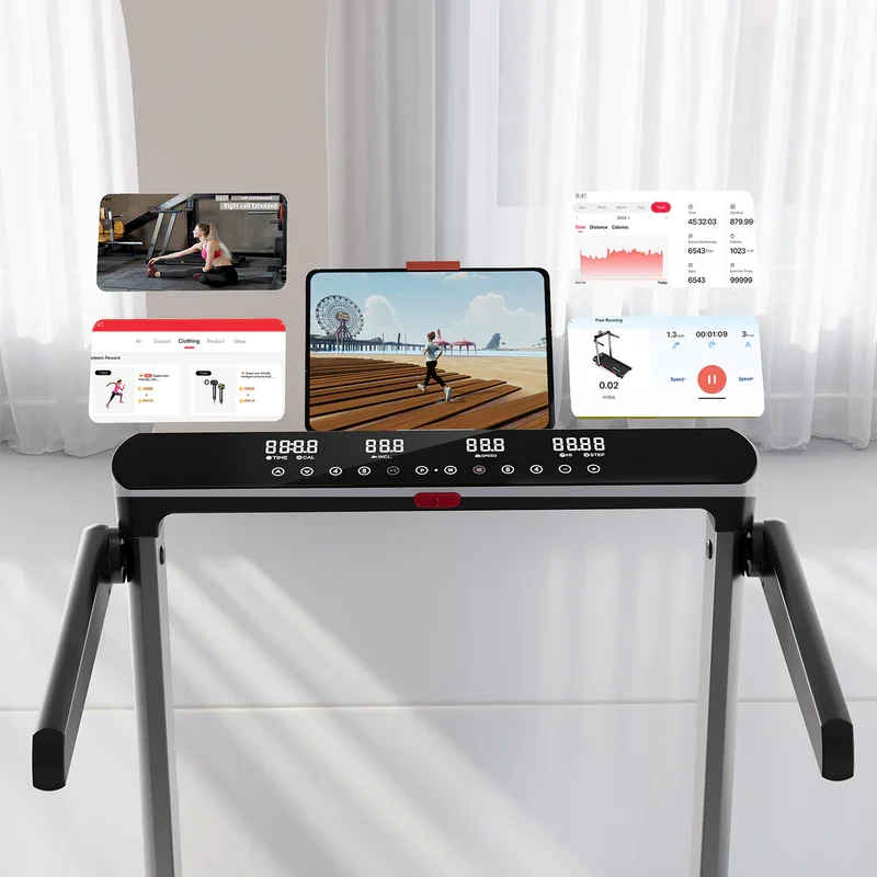 The treadmill is equipped with a LCD screen that displays exercise data in real-time. Our application also provides you with exercise courses, AI assisted training, and various professional activities