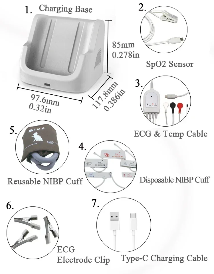 1,Charging Base 2,SpO2 Sensor 3,ECG & Temp Cable 4,Disposable NIBP Cuff 5,Reusable NIBP Cuff 6,ECG Electrode Clip 7,Type-C Charging Cable