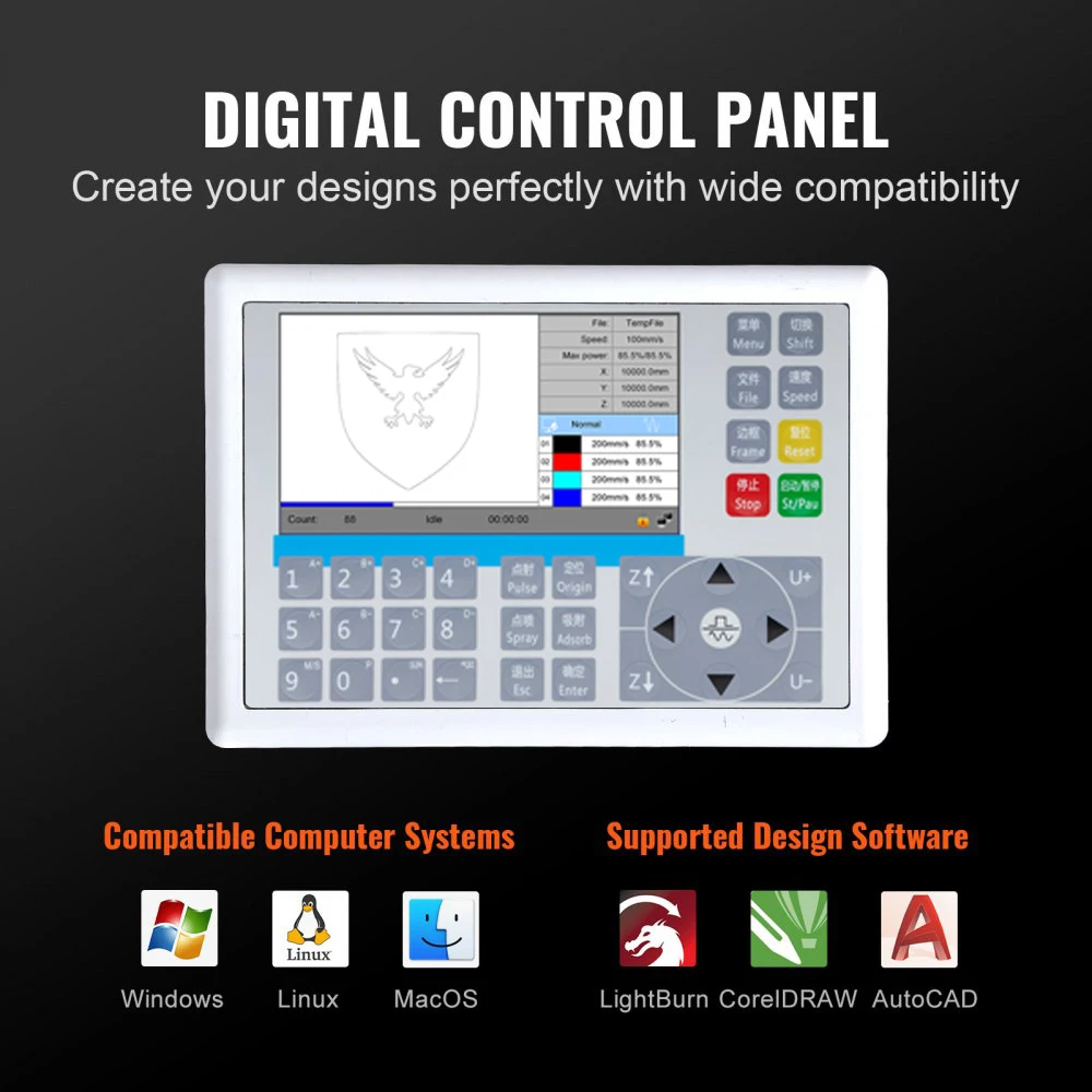 The digital control panel supports most design software, like LightBurn, CorelDRAW, and AutoCAD, and is compatible with Windows, Linux, and macOS.