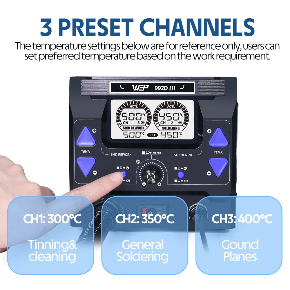 Each function (soldering and hot air) has three preset channels for easy temperature adjustment.