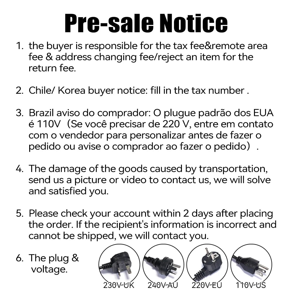 2.The price does not include the tariff imposed during shipment from China. If the buyer refuses to pay the tax fee and cooperate with customs clearance, it is agreed that the seller will not provide a refund.