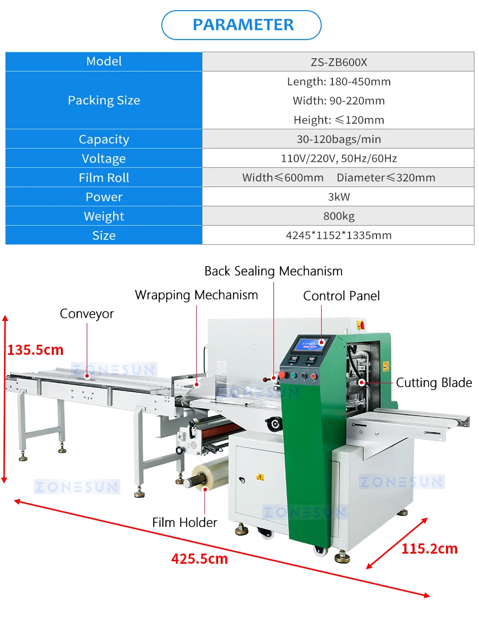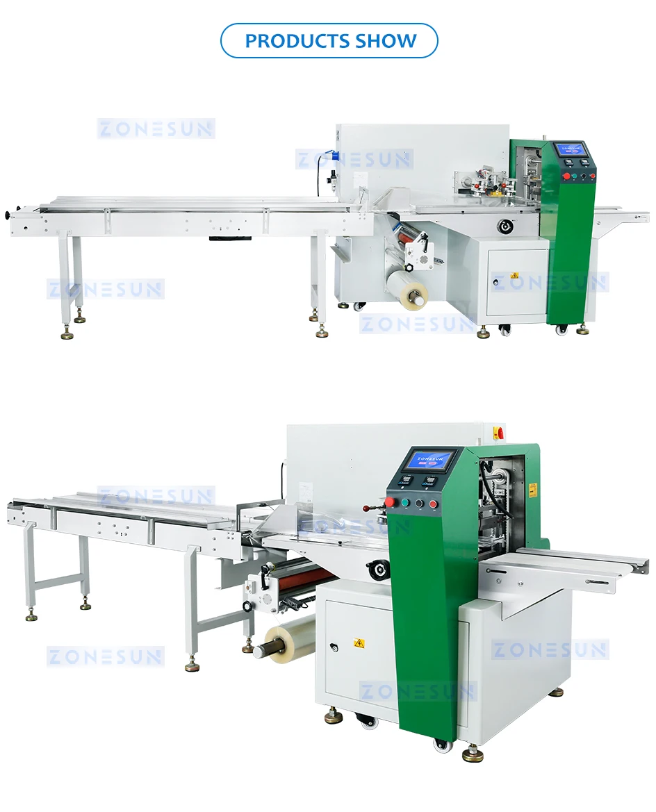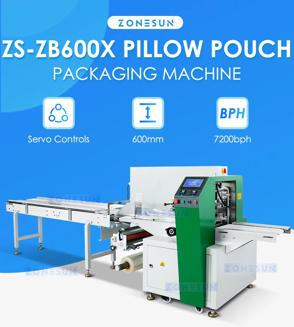 Introducing our latest product, a pillow packaging machine. This machine is designed to package various materials with a maximum film width of 600mm. Whether your film has color codes or not, our machine can handle it. The film roll is placed on top of the machine, and it uses an upward film feeding method. Equipped with 3 servo motor, this machine is highly efficient and accurate. During operation, the materials are placed on the conveyor belt and transported through the wrapping mechanism, wrapped in film, and then sealed. The blade cuts the material according to their lengths for packaging.